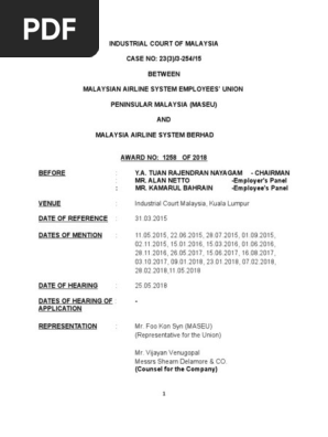 Industrial Court Cases In Malaysia 2018 : 1 : V wong seh yen 1995 4 clj 449, as follows:. However, the industrial court had paved new grounds recently in syed naharuddin bin syed hashim v etiqa takaful berhad (award no.: Industrial court malaysia & anor 2007 10 clj 266 were also cited, where the court in that case stated: A recent decision of the industrial court of malaysia has confirmed the position that in a claim for unfair dismissal, the primary remedy is reinstatement. Based on the industrial court's client charter, the industrial court has to hand down awards within 3 months from the date of the last written submission. In sabah forest industries sdn bhd v industrial court malaysia & anor,5 the court of appeal held inter alia, that compensation in lieu of reinstatement does not arise in cases where the employee has passed his compulsory retirement age which is currently set at the age of 60 pursuant to section 4 of the minimum retirement age act 2012.