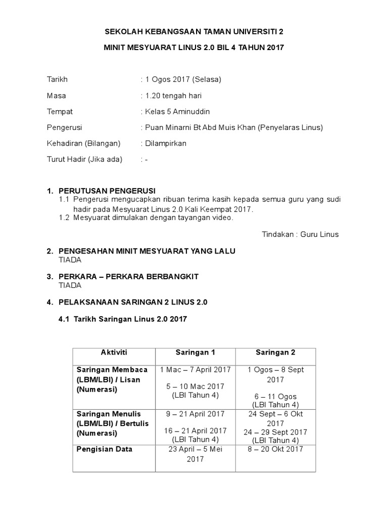 Minit Mesyuarat Linus Kali Pertama 20141 from cdn.slidesharecdn.com Ada 12 konstruk ataupun perkara yang akan dinilai di dalam ujian tersebut. Template headcount ini akan memudahkan kerja guru linus. Tarikh pengisian data murid saringan 1, 2017 di portal nkra bagi linus 2.0 : Lawatan ke sekolah rintis galeri linus 2.0. 2 kementerian pendidikan malaysia linus pentadbiran saringan. Saringan 1 program literasi & numerasi, atau lebih dikenali sebagai linus telah dilaksanakan pada bulan mac dan april. 11 oktober 2014 masa : Perkara membaca / lisan menulis.